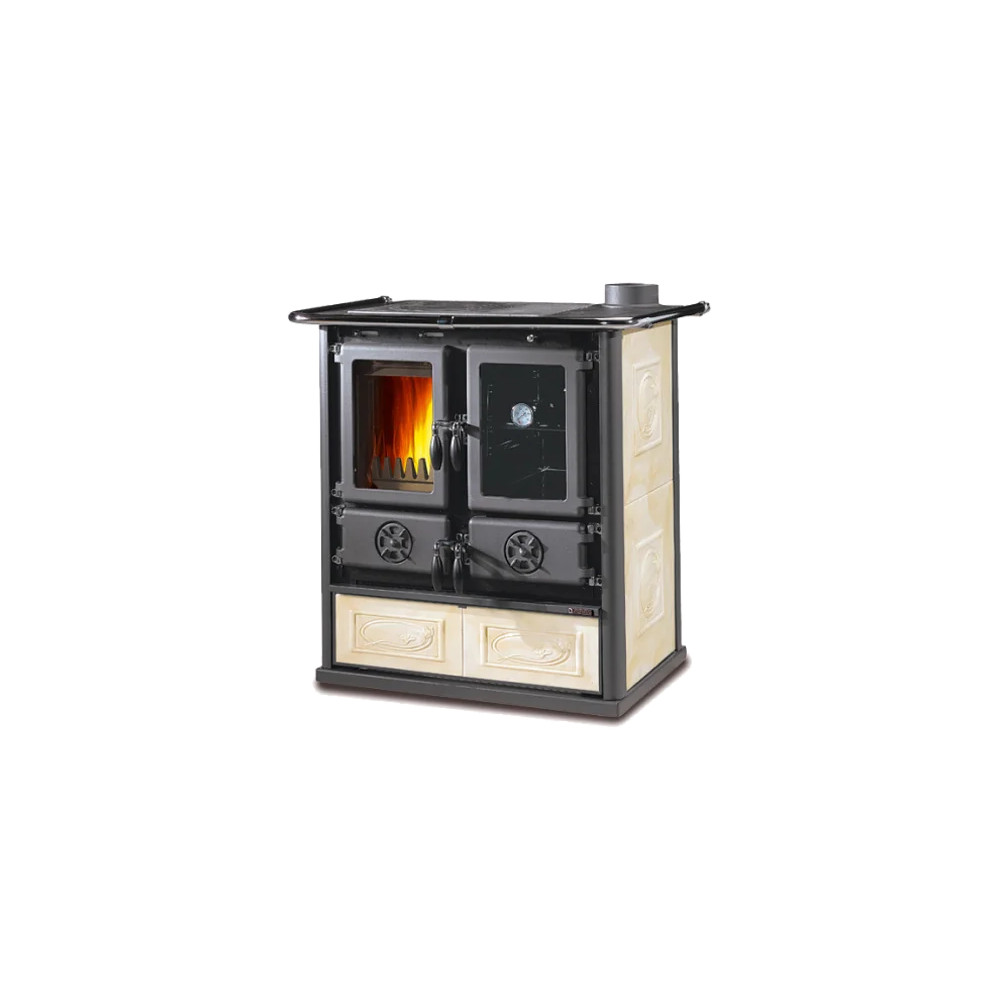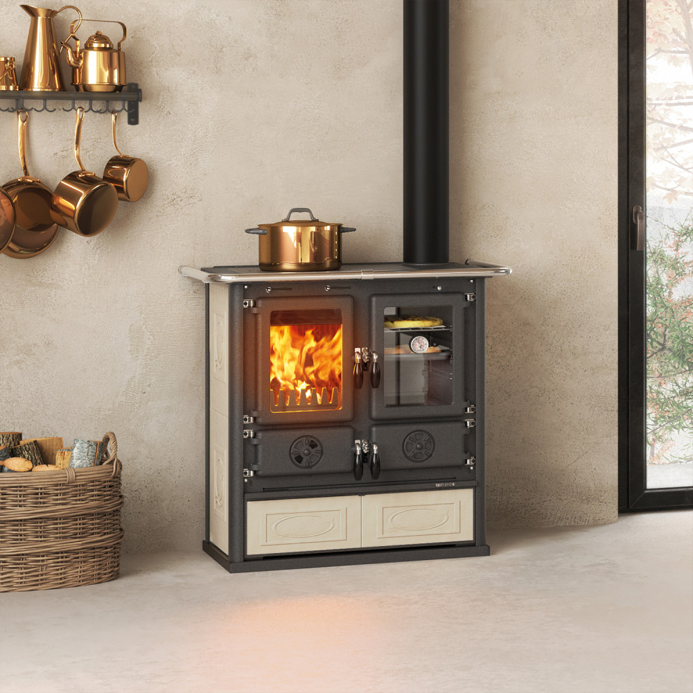 Rosetta er en vedkomfyr med høy varmeeffekt til både romvarme og matlaging. Alle våre vedkomfyrer er rentbrennende, og har mange praktiske finesser. Rosetta har glass i fyrdør, som gjør flammene synlige og skaper god atmosfære. Bevegelig brennrist, som gjør rengjøringen av brennkammer enkelt, med stor askeskuff under.  Under komfyren er det et varmeskap. Under ovnen er det en stor praktisk skuff til ovnsutstyr.