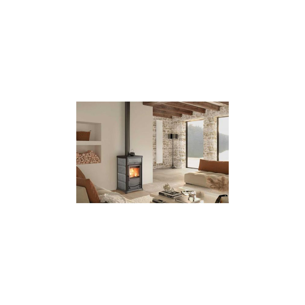 LaNordica Termorosella Plus på 11,1 kW er en vedovn med innebygget vannkappe. Den varmer rommet den står i, samtidig som den jobber mot det vannbårne systemet i huset. Ovnen må kobles til en akkumulatortank med innebygget bereder. Fra tanken fordeles varmen til gulvvarme, radiator, varmelist eller til dusjen. Ovnen leveres i tre utførelser. Bordeaux og Pergamena er dekket av keramiske fliser, mens Petra er dekket med serpentinstein. Kokeplaten på toppen er praktisk til kveldskaffen.